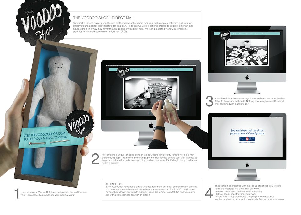To show business customers how effective innovative and engaging direct mail can be, we proposed sending a network enabled Voodoo doll to select priority clients. Messaging would drive potential customers to a website where they could use the doll to control an unsuspecting person on-screen. An engaging, entertaining, and informative example of the potential of direct mail.